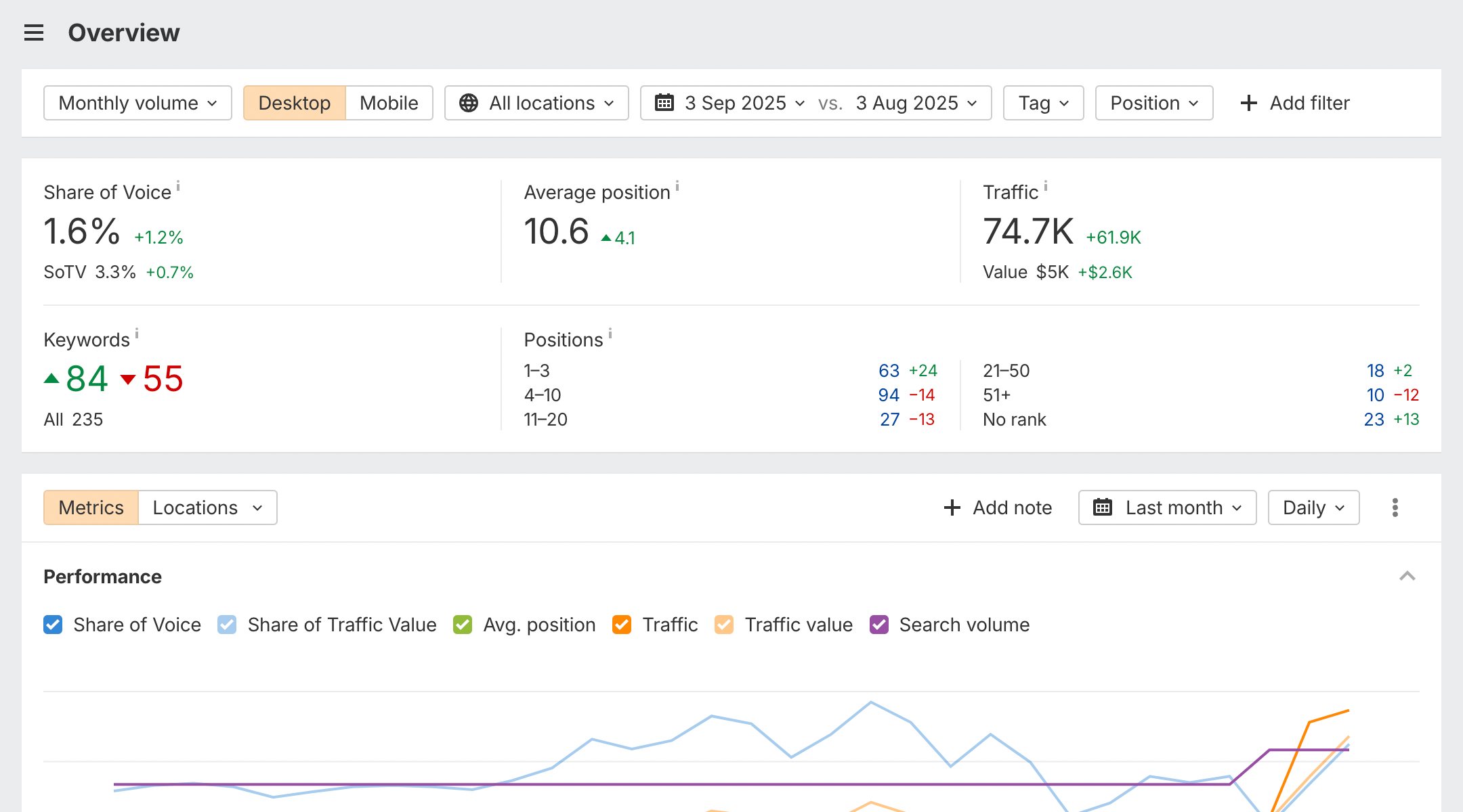 Suivez l’évolution de vos mots-clés, identifiez les facteurs qui déterminent vos gains et vos pertes, et repérez les domaines dans lesquels vos concurrents gagnent du terrain.