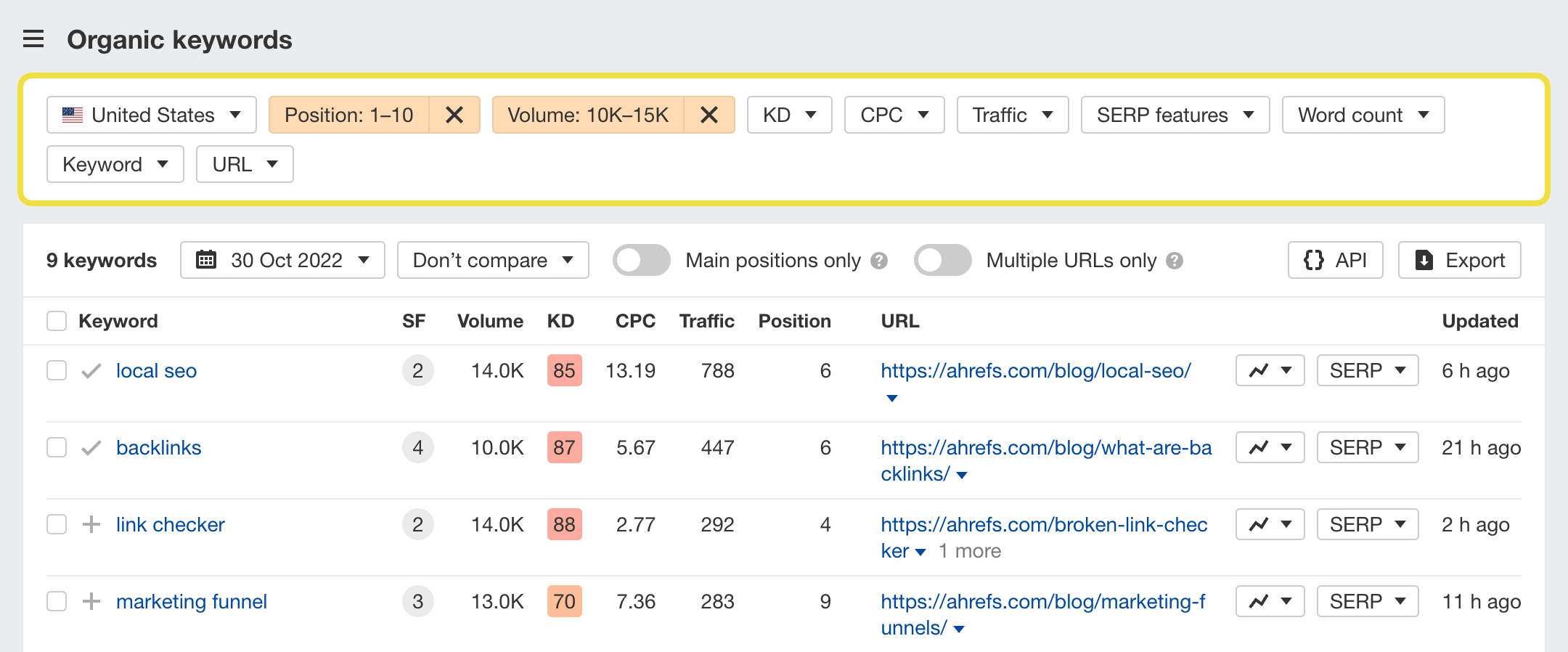See the total number of backlinks and estimated organic search traffic to each ranking page, plus a few other important SEO metrics: