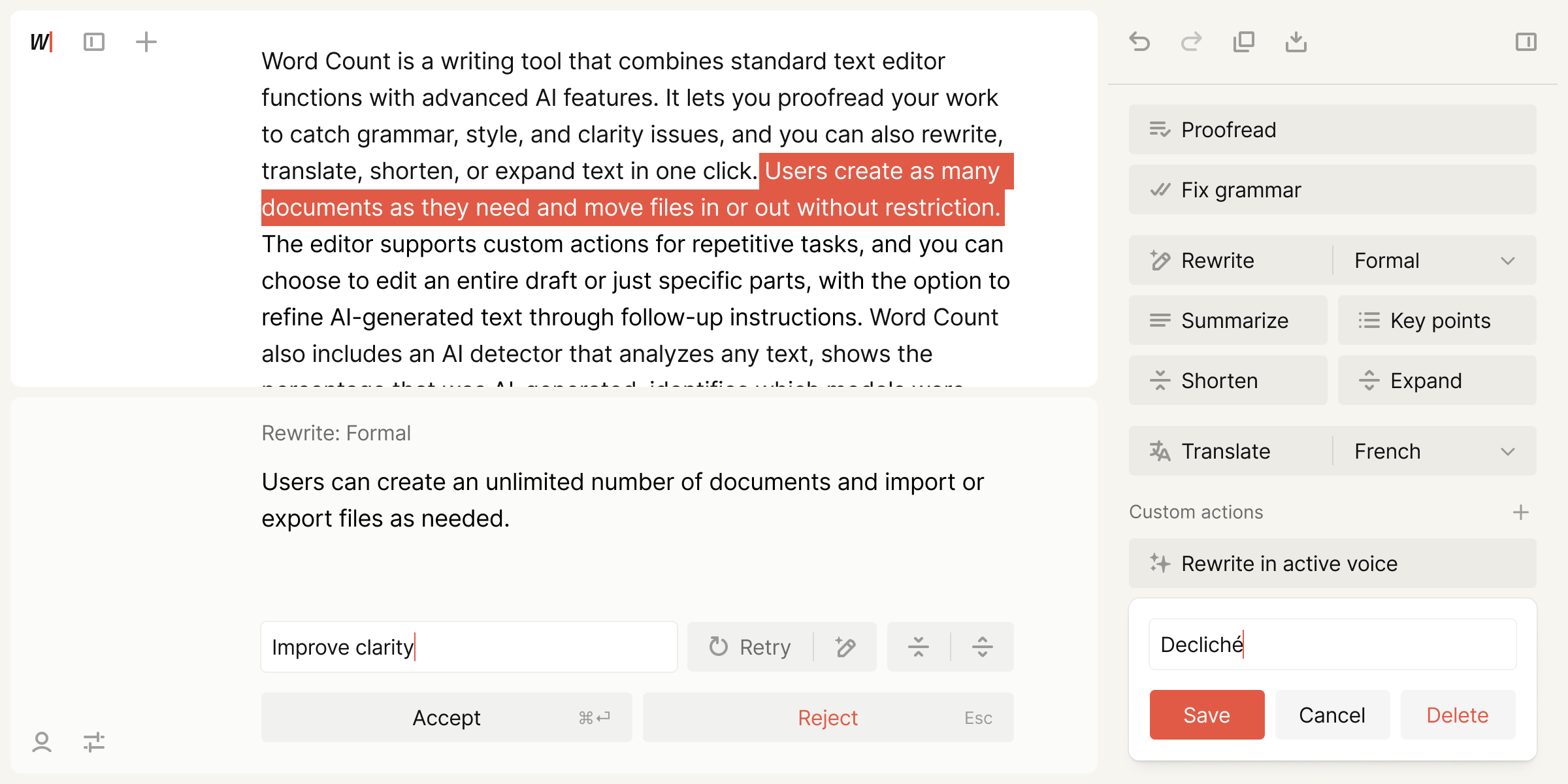Proofread your work to fix grammar, style, and clarity issues. Rewrite, translate, shorten, or expand text in one click. Create an unlimited number of documents, and easily import or export text files.