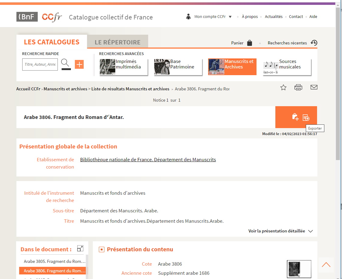 Le portail Biblissima utilise une extraction des instruments de recherche de BAM pour enrichir les descriptions des manuscrits de la BnF d’autres bases agrégées (avec une sélection d’informations).