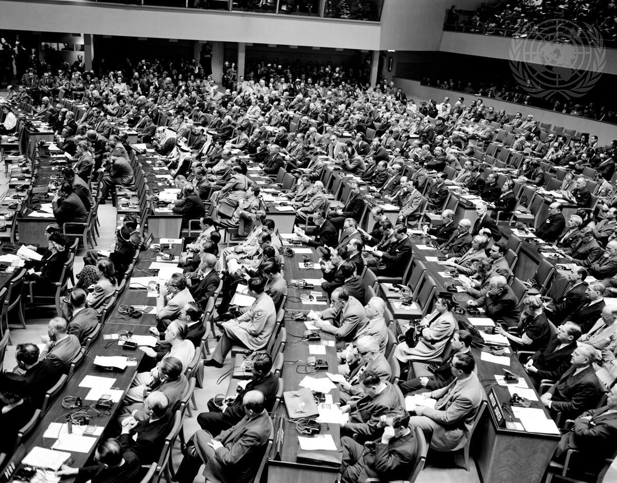 The first General Assembly in New York had “One World” as its theme. To emphasize this fact, a large map of the world in blue and gold was installed behind the President of the General Assembly’s rostrum.