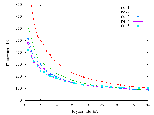 A month before the Thai floods I presented initial results at the Library of Congress. A month after the floods I was able to model the effect of price spikes, and demonstrate that the endowment needed for a data collection depended on the Kryder rate in a worrying way. At the Kryder rates we were used to, with cost per byte dropping rapidly, the endowment needed was small and not very sensitive to the exact rate. As the Kryder rate decreased, the endowment needed rose rapidly and became very sensitive to the exact rate.