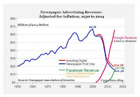 But, as I pointed out in Open Access and Surveillance using this graph (via Yves Smith, base from Carpe Diem), there is another problem. Facebook, Google et al have greatly increased the demand for "news" while they sucked the advertising dollars away from the companies that generated actual news. The result has to be a reduction in the quality of news. The invisible hand of the market ensures that a supply of news-like substances arises, from low-cost suppliers to fill the gap.