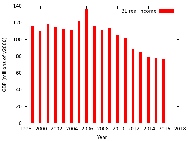 The budgets of libraries and archives, the institutions tasked with acting as society's memory, have been under sustained attack for a long time. I'm working on a talk and I needed an example. So I drew this graph of the British Library's annual income in real terms (year 2000 pounds). It shows that the Library's income has declined by almost 45% in the last decade.