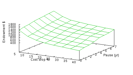 The graph plots the endowment required to have a 98% probability of surviving 100 years (z-axis) against the length of the initial pause in disk cost decrease in years (y-axis), and the percentage annual decrease in disk cost thereafter (x-axis).As expected, the faster the disk price drops and the shorter the pause before it does, the lower the endowment needed. In this simulation the endowment needed ranges from 4.2 to 17.6 times the initial cost of storage, but these numbers should be taken with a grain of salt. It is early days and the model has many known deficiencies.