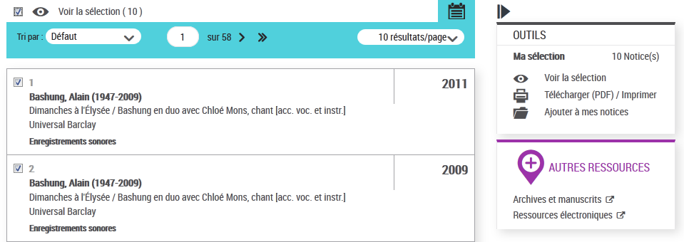 Il est possible sélectionner une liste de notices pour la visualiser ou l'imprimer dans le Catalogue (bouton Voir la sélection).