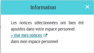Lorsque une ou des notices ont été ajoutées à l'espace personnel, le message suivant s’affiche dans une pop-up.
