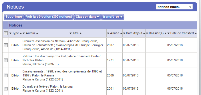 Par défaut, les notices bibliographiques s’affichent. On peut afficher soit les notices bibliographiques, soit les notices d’autorité, ou toutes les notices en utilisant la commande en haut à droite. On peut créer des dossiers pour y classer les notices.