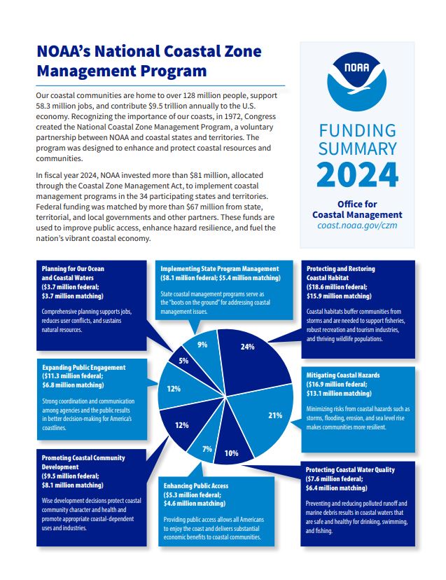 The National Coastal Zone Management Program comprehensively addresses the nation’s coastal issues through a voluntary partnership between the federal government and coastal and Great Lakes states and territories. Authorized by the Coastal Zone Management Act of 1972, the program provides the basis for protecting, restoring, and responsibly developing our nation’s diverse coastal communities and resources.