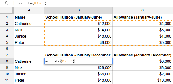 =) followed by the function name and any input value — for example,=DOUBLE(A1)— and press Enter. - The cell momentarily displays