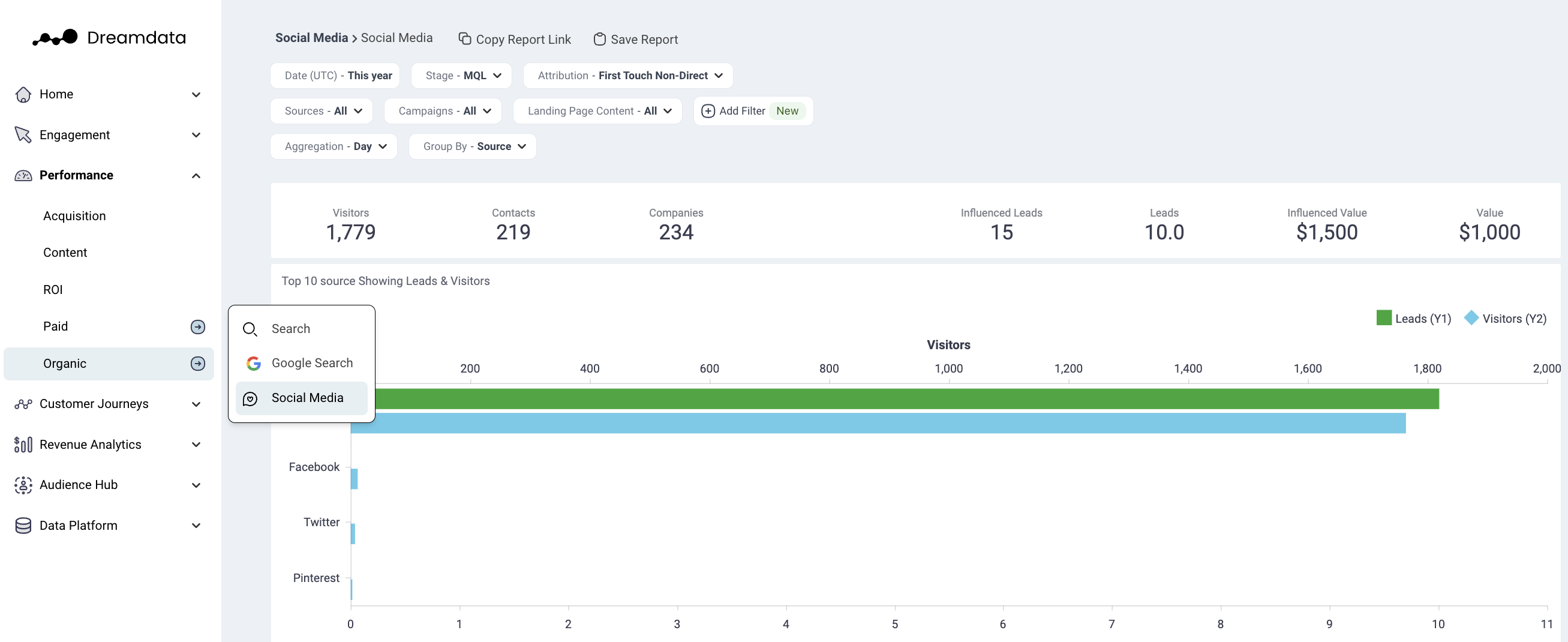 We provide a graph showing the organic traffic and attributable deals of each Social Media over the period of time specified in your Filters. This information can help you understand which Social Media convert better.