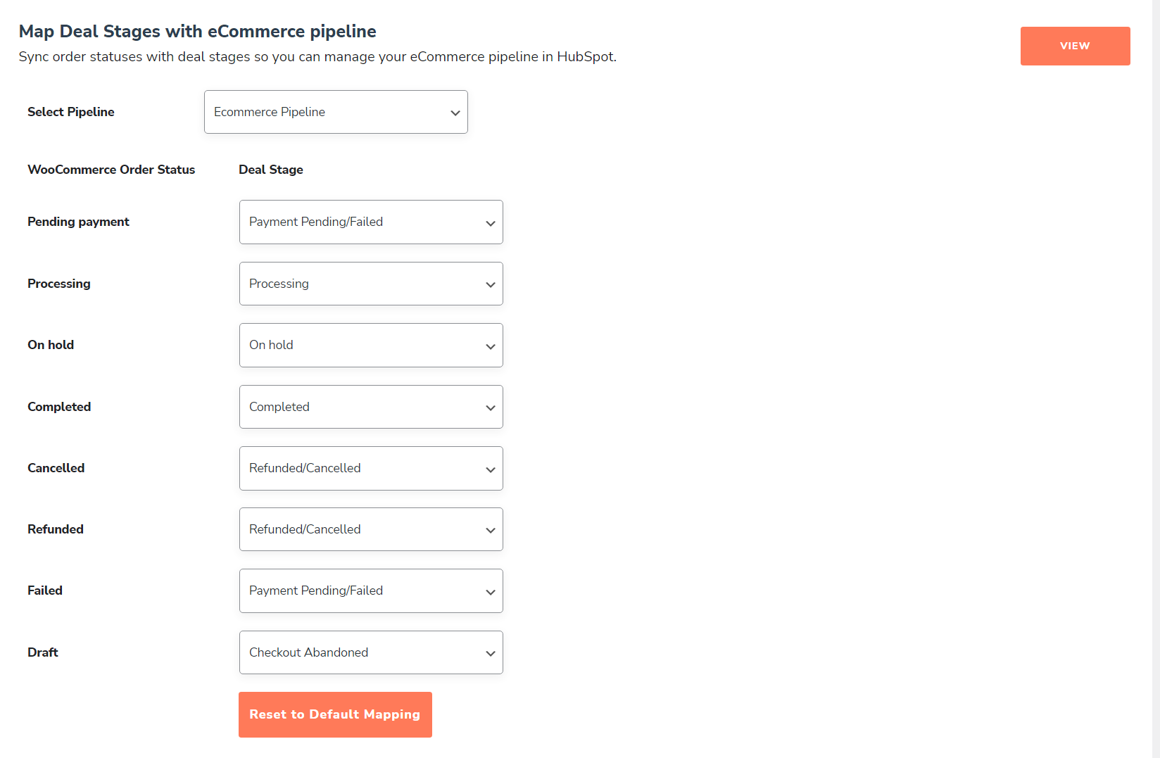 - Map deal stages with eCommerce pipeline: You can select your pipeline and map your WooCommerce order statuses with HubSpot deal stages defined in your HubSpot CRM’s pipelines. (Mapping is already done for the default WooCommerce order statuses)