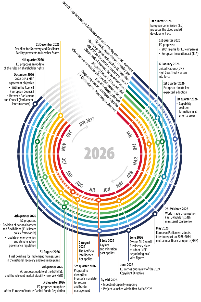 This tenth edition comes at a highly turbulent time in geopolitics. The balance of power in the world is shifting, and the rules-based international order now faces greater and more frequent challenges than ever before. The selection of issues for 2026 reflects this heightened focus on external policies. The publication addresses three directly affecting the EU: Ukraine’s integration into the EU, European defence capability gaps, and EU-China relations. These issues interact with other trends and developments with geopolitical consequences, such as the impact on the web of artificial intelligence (AI), the potential of Europe’s startup companies, the tougher stances on irregular migration being taken around the world, including in Europe, and challenges on climate policy and ocean protection – all covered below. All these issues, as well as the ‘normal business’ that is not highlighted in this paper but is the European Union’s daily work in delivering for its citizens, require financial means and governance. So this paper also covers the discussions on shaping Europe’s long-term budget, or multiannual financial framework, for the coming years, as well as lessons drawn from implementing the post-COVID-19 Recovery and Resilience Facility.