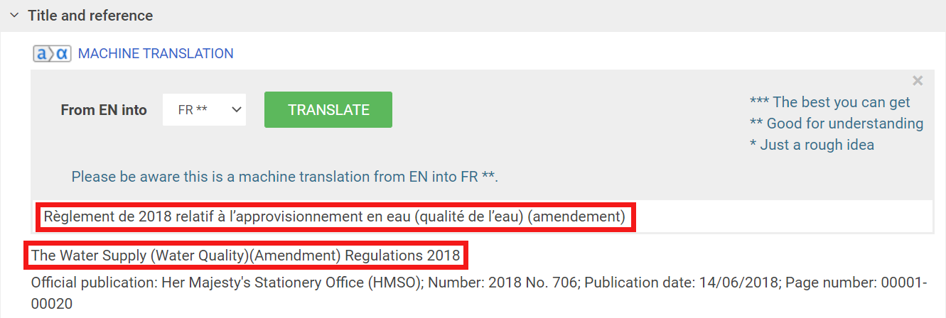 - The display of the machine translation results in the National Transposition Measures page is improved: the original language and the translation of the title of the document appear simultaneously.