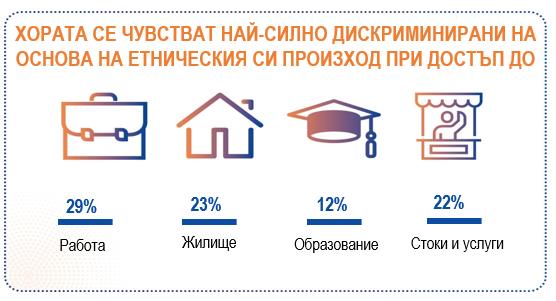 Дискриминацията на пазара на труда е повод за загриженост не само при търсенето на работа, но и на работно място, където 22 % от анкетираните се чувстват дискриминирани заради етническия си или имигрантски произход.