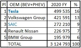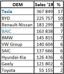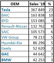Looking at last year standings, and comparing it with 2018, there are noticeable changes, Tesla jumped from #5 to the leadership, Renault-Nissan dropped from #1 to 3rd, Geely dropped two positions, to #6, SAIC was up two spots to #6, while the Volkswagen was down two spots, to #9.