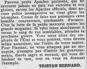 C'est avec cet humour persistant, parfois noir, que Tristan Bernard traverse les deux conflits mondiaux. Dès 1904 il rédige des articles pour l'Humanité, le journal socialiste de Jean Jaurès. Il y livre à l’occasion sa vision ironique de la société et de la politique à travers de courts articles, comme « Fléaux sur mesure », ou « Cours du soir pour les Apaches », qui traduisent sa haine de la guerre.