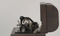 Commercialisé à partir de 1895, le Graphophone K est le premier phonographe à moteur électrique produit par la Graphophone Company des cousins Chichester et Graham Bell et de Charles Tainter, concurrente de la Compagnie générale du phonographe d’Edison. Construit à partir de pièces récupérées dans les stocks d’invendus de la compagnie, ce modèle, très rare, permettait la lecture des cylindres Graphophone comme des cylindres Edison.
