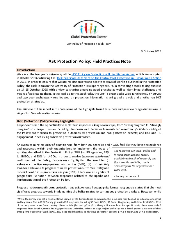 The Task Team on the Centrality of Protection is supporting the GPC in convening a stock-taking exercise on 14-15 October 2018 with a view to sharing emerging good practice as well as identifying challenges and means of addressing them. In the lead-up to the Stock-take, the CoP TT organized a wide-ranging IASC PP survey