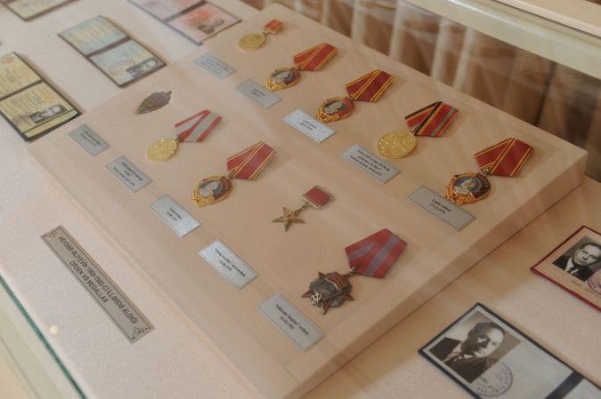 В музее демонстрируются также предметы и оборудования, доставленные из рабочего кабинета нашего общенационального лидера: карта Азербайджана и мира, стол, кресло, настольная лампа, календарь, пенал, ваза…, фотографии с верным спутником жизни, известным офтальмологом, академиком Зарифой ханум, любимым внуком Гейдаром, другом Сулейманом Демирелем.