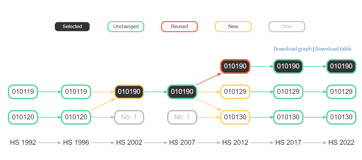 The Subheading visualizer function displays graphically the manner in which a specific HS code has changed across different versions of the Harmonized System (e.g. mergers, splits and complex cases), including the explanation by the WCO on why the changes were undertaken in the context of a particular amendment. The English and French versions of these explanations, as well as the correlation tables, have been sourced directly from the WCO webpage. However, the information in Spanish is an unofficial translation by the WTO Secretariat.
