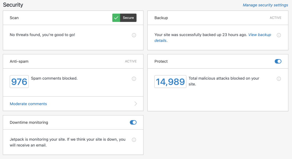 Para conocer las funciones generales y leer las preguntas frecuentes, consulta las funciones de Jetpack Security.