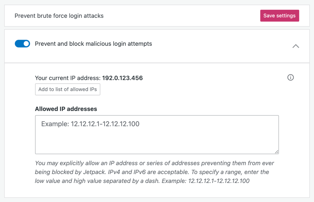Una vez que la hayas activado, podrás indicar las direcciones IP aceptadas desde la misma página Ajustes del sitio. Es posible que necesites una lista de permisos en caso de que se produzcan demasiados intentos fallidos de acceso en el sitio o si Jetpack detecta un comportamiento inusual desde tu dirección IP actual.