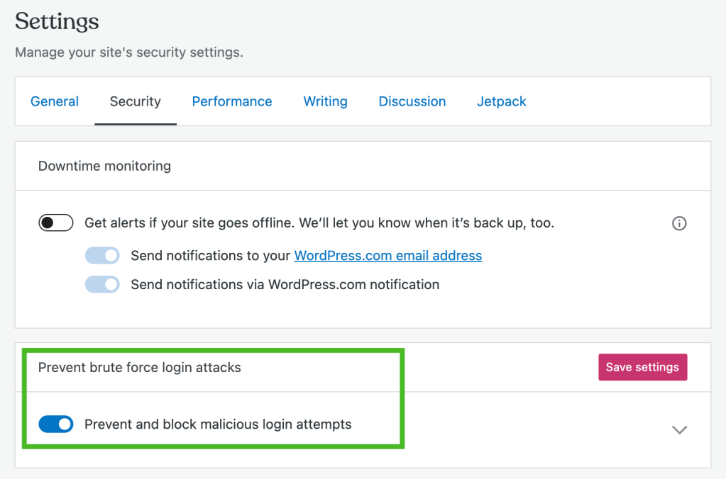 Esta función se activa por defecto cuando conectas Jetpack a tu cuenta de WordPress.com. Se puede desactivar cuando quieras (incluso tras el bloqueo) desde el escritorio de WordPress.com, en la página Ajustes del sitio.