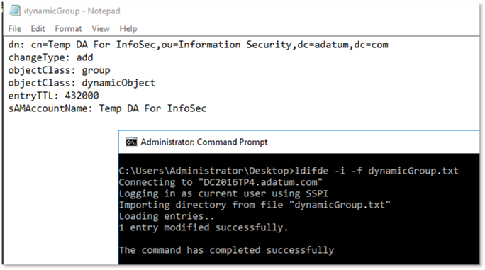 Figure 1: Creating a Dynamic Object with ldifde.exe.