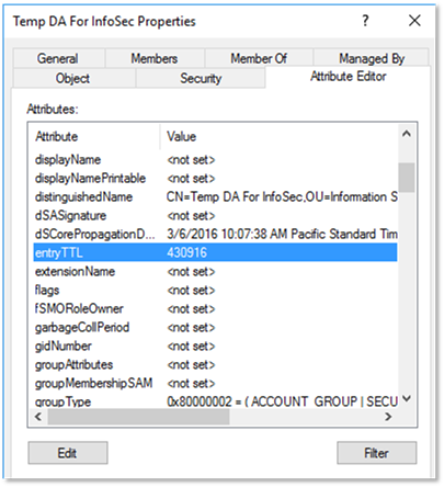 Now if you go look at the newly-created group in AD Users & Computers, you’ll see that it has an entryTTL attribute that is steadily counting down to 0: