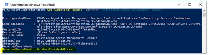 Enable-ADOptionalFeature 'Privileged Access Management Feature' -Scope ForestOrConfigurationSet -Target adatum.com