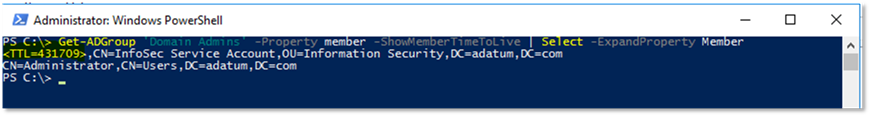 Now isn’t that a little easier and more straightforward? Our InfoSec service account now has temporary membership in the Domain Admins group for 5 days. And if you want to view the time remaining in a temporary group membership in real time: