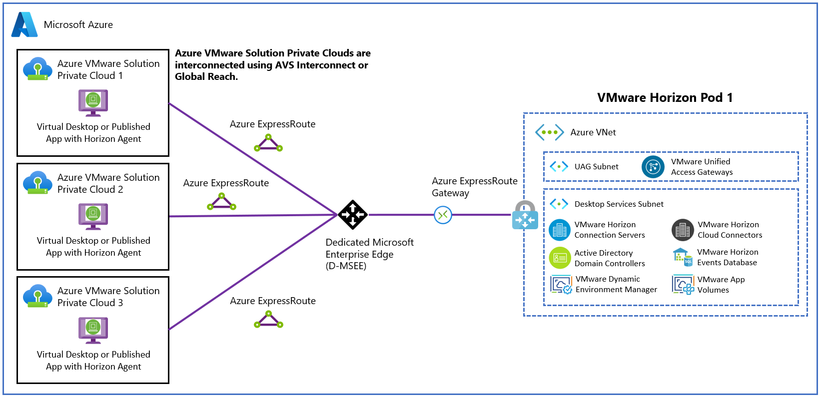 The connection from Azure Virtual Network to the Azure private clouds / SDDCs should be configured with ExpressRoute Connections (FastPath enabled). The following diagram shows a basic Horizon pod deployment.