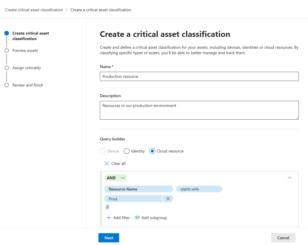 Add a name and description for your new classification, and use under Query builder, select Cloud resource to build your critical assets rule. Then select Next.