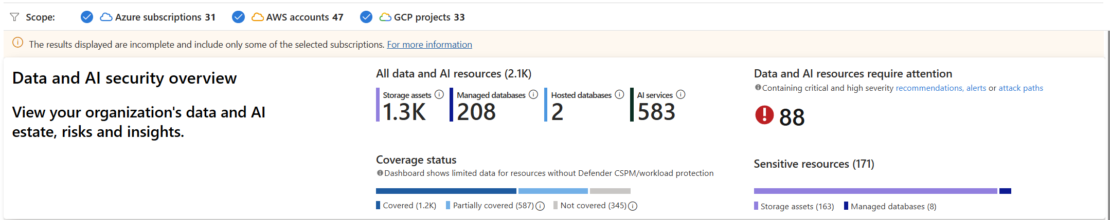 The data security dashboard feature is enabled at the subscription level. The dashboard information is based on the data and AI resources in your subscription and the plans enabled in your subscription.