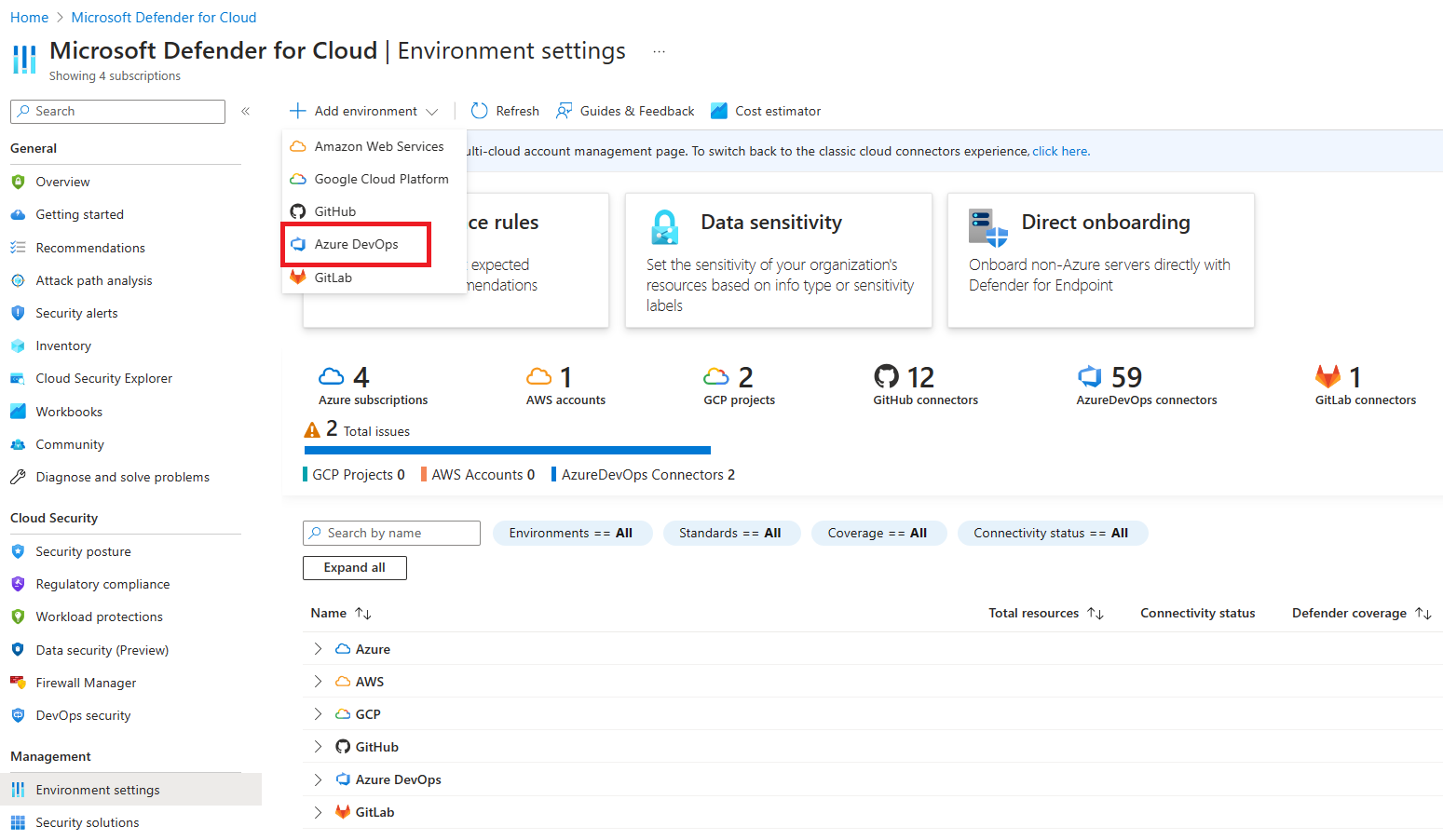 This page provides a simple onboarding experience to connect Azure DevOps environments to Microsoft Defender for Cloud, and automatically discover Azure DevOps repositories.
