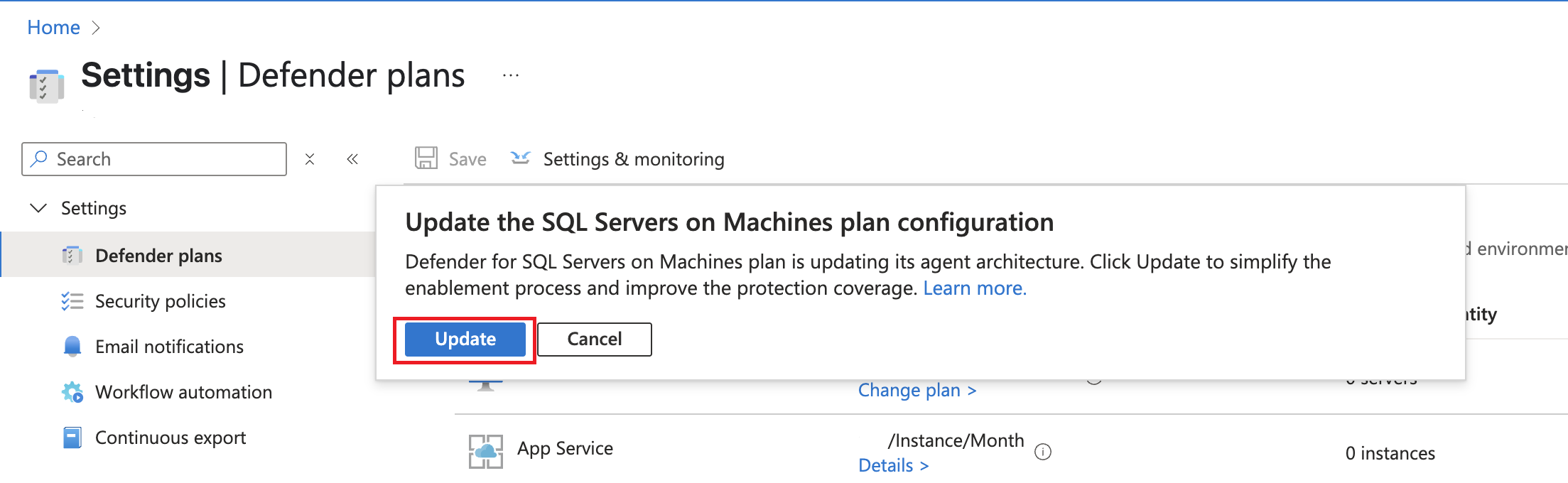 On the Overview page, select Update the configuration in Defender for SQL Servers on Machines plan for multiple subscriptions.