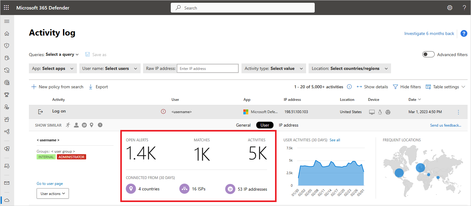 In the Activity log, you can open an activity to display the Activity drawer. Select User to view the user insights tab. This tab includes information like number of alerts, activities, and where they've connected from, which is important in an investigation.