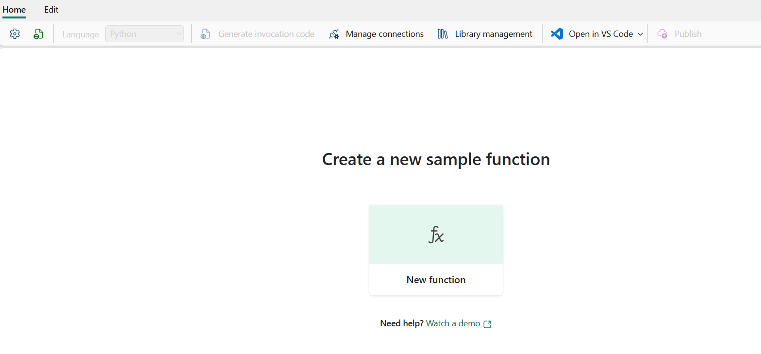 hello_fabricPython function template. The Functions explorer shows all the functions that are published and ready to be invoked.Once the