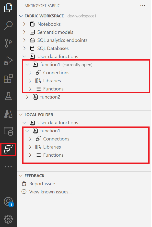 You can view the user data functions item in the Fabric explorer in VS Code within the currently opened workspace.