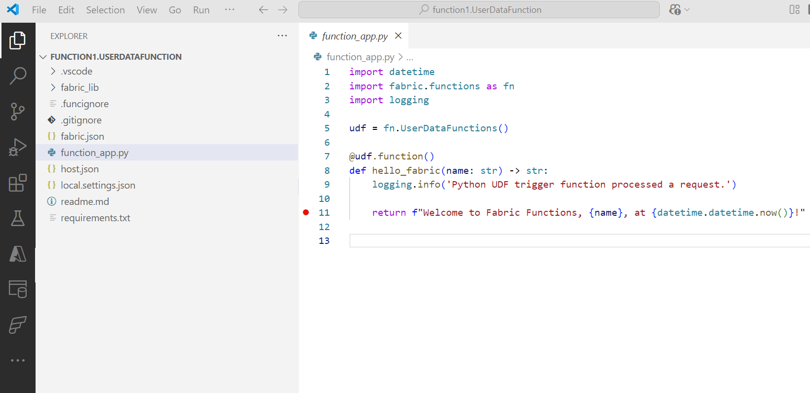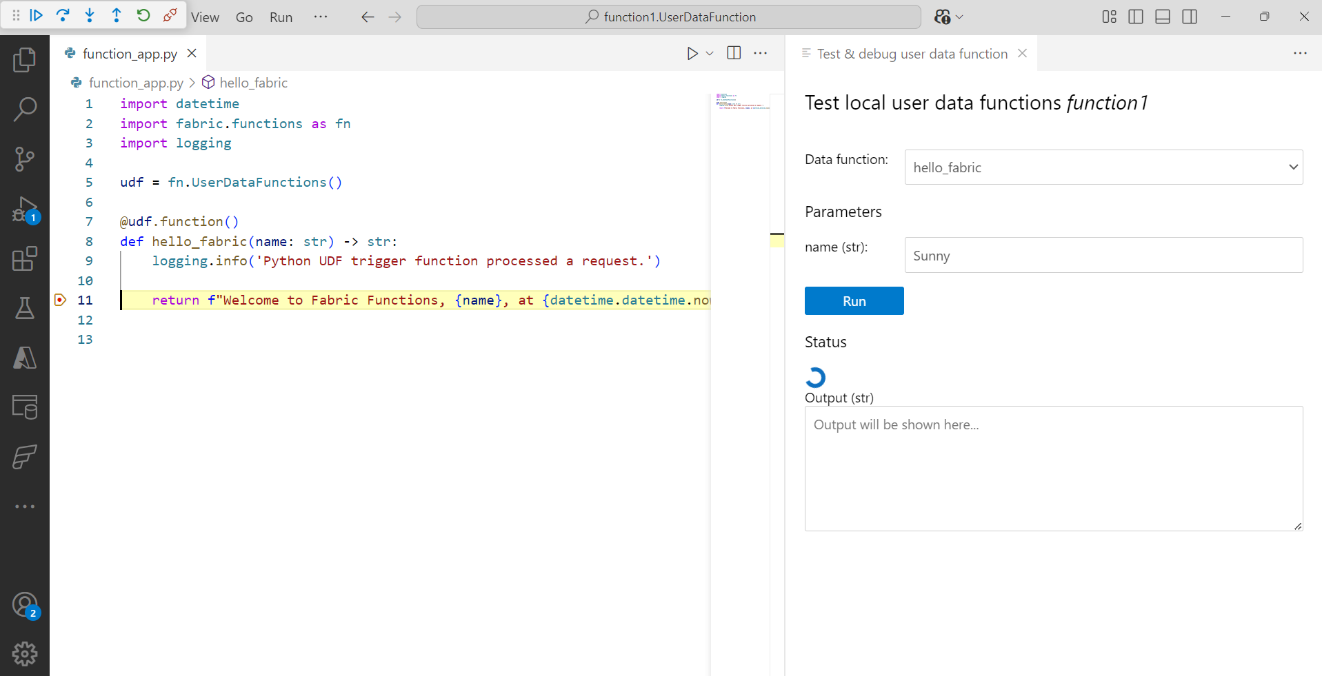 Select F5 to debug your Fabric functions. You can add a breakpoint anywhere in your code. In debug mode, your breakpoints are hit as expected and test your code as you would test a deployed function.
