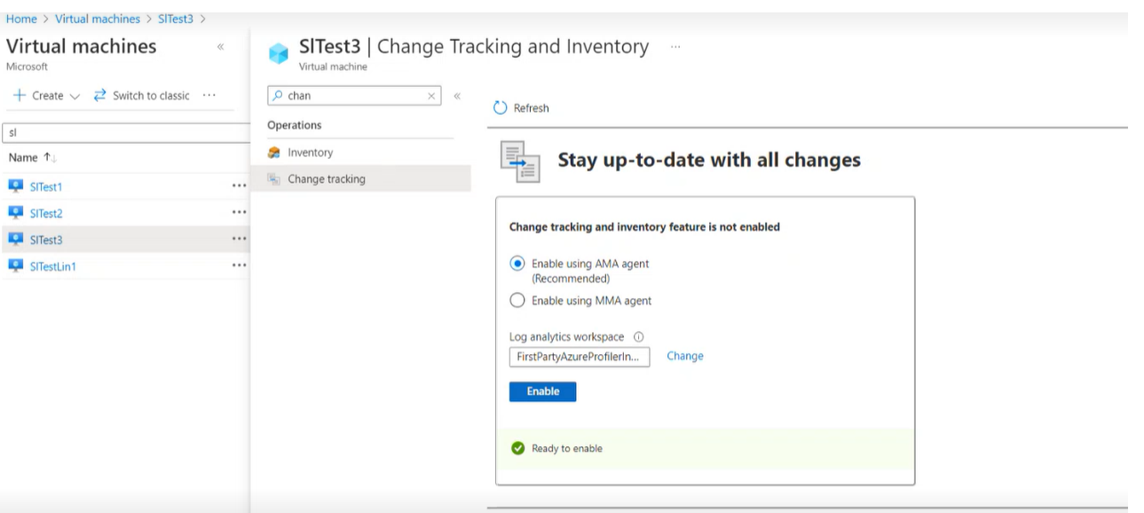 [Change Tracking を有効にする] ページで、ページの上部にあるバナーを選択します。ここをクリックして、Azure Monitoring Agent (AMA) エクスペリエンスで新しい変更履歴とインベントリを試してください。