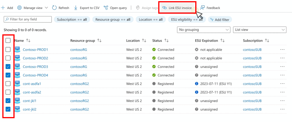 リンクする各SQL Serverインスタンスの横にあるチェックボックスを使用して、[ESU 請求書のリンク]を選択します。