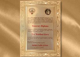 In August 2014, Mehriban Aliyeva was honoured with an Honorary Diploma of the State of Kuwait for her worldwide promotion of the Islamic cultural heritage, noble activities both in Azerbaijan and beyond its boundaries, as well as great contribution she has made to education and healthcare. |