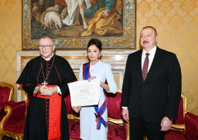 On February 22, 2020, First Vice-president of the Republic of Azerbaijan Mehriban Aliyeva was honoured with the highest degree of the Pontifical Order of Knighthood – Knights Grand Cross of the Order of Pius IX (Dama di Gran Croce dell’ordine Piano) - for her contribution to the development of culture, including the relations with institutions of the Holy See. State Secretary of the Holy See Cardinal Pietro Parolin presented the order to First Vice-president Mehriban Aliyeva in Vatican. |