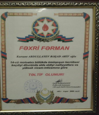 5)Azərbaycan Respublikası Prezidentinin adından Azərbaycan Respublikası Müdafiə nazirinin 26 iyun 2018-ci il tarixli əmri ilə “Azərbaycan Ordusunun 100 illiyi (1918-2018)” yubiley medalı ilə təltif olunub;
