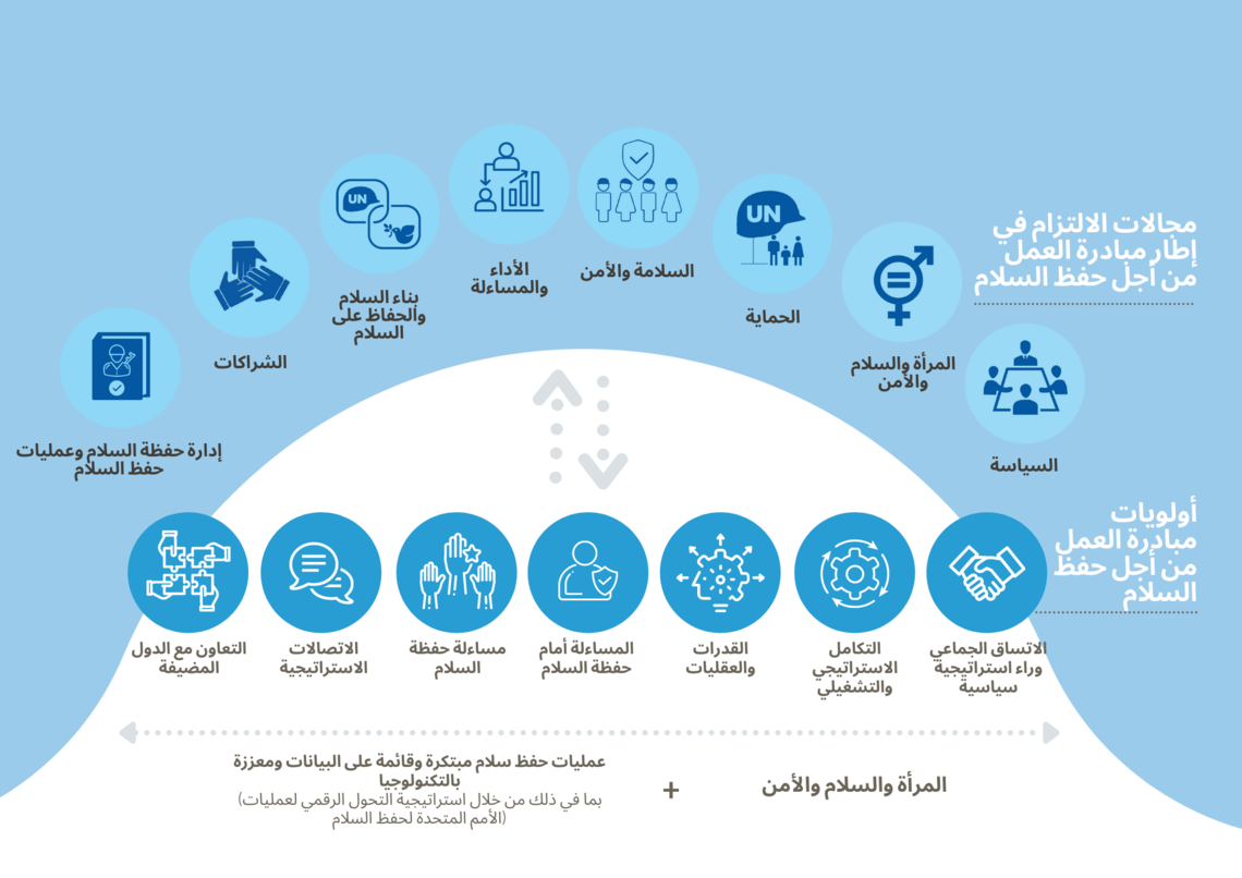 وللتصدي لهذه التحديات، أطلق الأمين العام في عام 2018 مبادرة العمل من أجل حفظ السلام، بهدف تجديد الالتزام السياسي المتبادل بعمليات حفظ السلام. ودعا الأمين العام الدولَ الأعضاء إلى دعم تطوير مجموعةٍ من المبادئ والالتزامات المتفق عليها بشكلٍ متبادل لإنشاء عمليات لحفظ السلام صالحة للمستقبل.وتهدف مبادرة العمل من أجل حفظ السلام إلى تغيير تركيز عمليات حفظ السلام وتوجيهه نحو توقعات واقعية، وجعل عمليات حفظ السلام أقوى وأكثر أماناً، وحشد دعم أكبر للحلول السياسية ولقوات منظمة ومجهزة ومدربة بشكلٍ جيد. وقد وافقت الدول الأعضاء والمنظمات الإقليمية على إعلان الالتزامات المشتركة بشأن عمليات الأمم المتحدة لحفظ السلام، والذي يتضمن 45 التزاماً ضمن ثمانية مجالات رئيسية. ولزيادة الزخم بشأن العمل من أجل حفظ السلام من خلال التركيز على عددٍ قليلٍ من الأولويات المنهجية والشاملة، أطلق الأمين العام في عام 2021 مبادرةَ العمل من أجل حفظ السلام المحدثة لتوفير استراتيجية تنفيذ للأولويات الرئيسية لمبادرة العمل من أجل حفظ السلام التي تركز على سبعة مجالات مواضيعية.