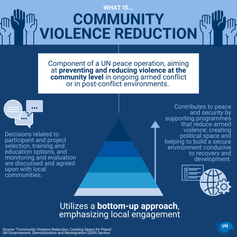 为此,联合国已经从传统、有序和以个人为重点的复员方案转向以社区为重点的复员方案,这被称为“第二代复员方案”,其中的首要工作就是减少社区暴力。
