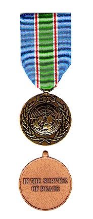 • 标准勋章——铜制徽章,正面是联合国标志,用“联合国”字样围绕,标志和字样均为浅浮雕;反面是浅浮雕的“为和平服务”字样。这种标准徽章用于除上述两个特派团以外的其他所有特派团。