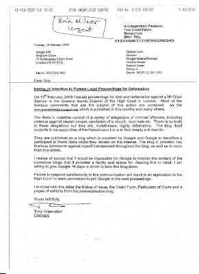 There are several interesting contradictions between it and the content of the Claim, which I am only reprinting the first page, although Google sent it all to me. (I can't believe how good Google was in all of this, and I intend upon sending them a thank you note as well as encouraging all of us to support them when they make these decisions). Read both items carefully (clicking on them enlarges them), and you will note some very odd things. There is a serious contradiction there, and I know all of you can see it. The letter practically contradicts the allegations of the claim itself!! This should not escape the attentive eye and it makes one wonder what the claim is even supposed to be about if not just stopping Gilad Atzmon and trying to squeeze money out of him based on the hope that others are inattentive. But let's examine still more: Yes, Tony is suing Gilad and yes, Tony claims, without any evidence, just his good name (sic) that "There is no truth in these allegations but they are, nonetheless, highly defamatory. The blog itself purports to be supportive of the Palestinians but is in fact deeply anti-Semitic".